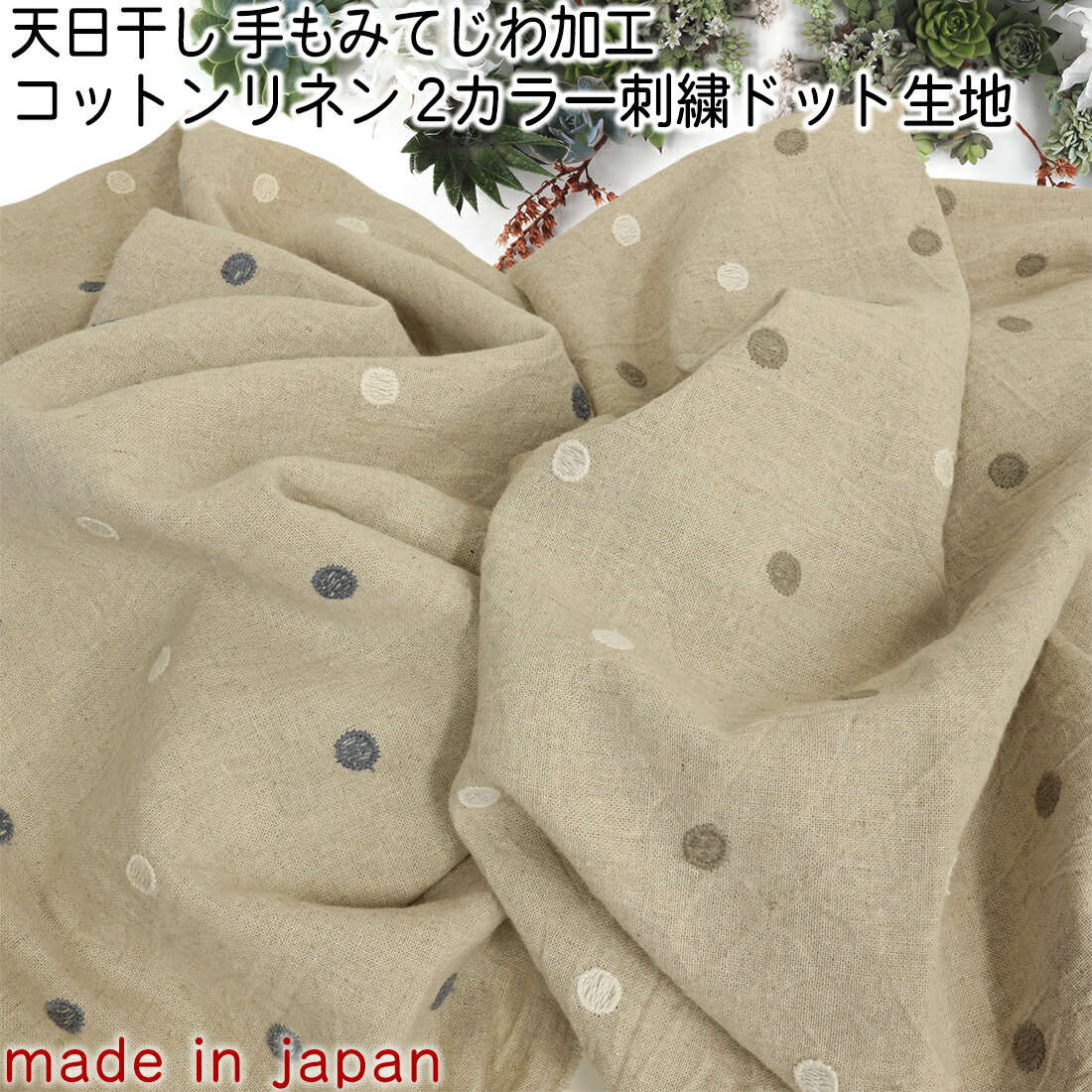 【秋の装い】京都桂川水系天然水天日干し手もみてじわ加工コットンリネン2カラードット刺繍生地10cm単位2mまでネコポス可|エンブロイダリー|綿麻|ハーフリネン|国産| 日本産|大人可愛い|ナチュラル|水玉|ポルカ|フレンチ|生成り|ベージュ|手作り|柄ワンピース|大人服