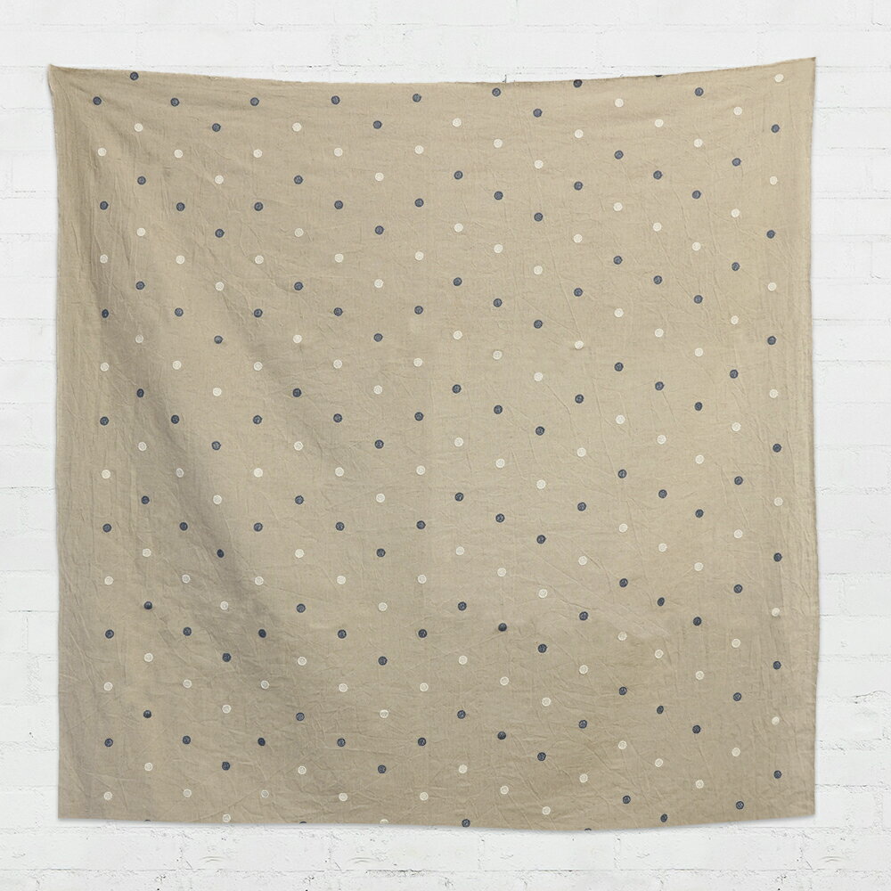 京都桂川水系天然水天日干し手もみてじわ加工 コットンリネン2カラードット刺繍生地 柔らかな風合いのハーフリネン生地にふっくら立体感のある水玉柄の刺繍を施してあります 水玉刺繍糸は2配色使い、落ち着いた組み合わせなので スカートやワンピースやチュニックなどのお洋服に。
