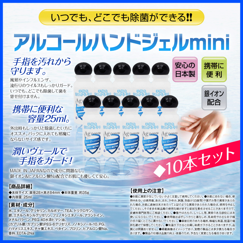 ゆうパケット送料無料 アルコールハンドジェル 25ml 10個セット(日本製 予防グッズ 銀イオン配合 ヒアルロン酸Na配合 トラベル 出張 携帯用 洗浄 )