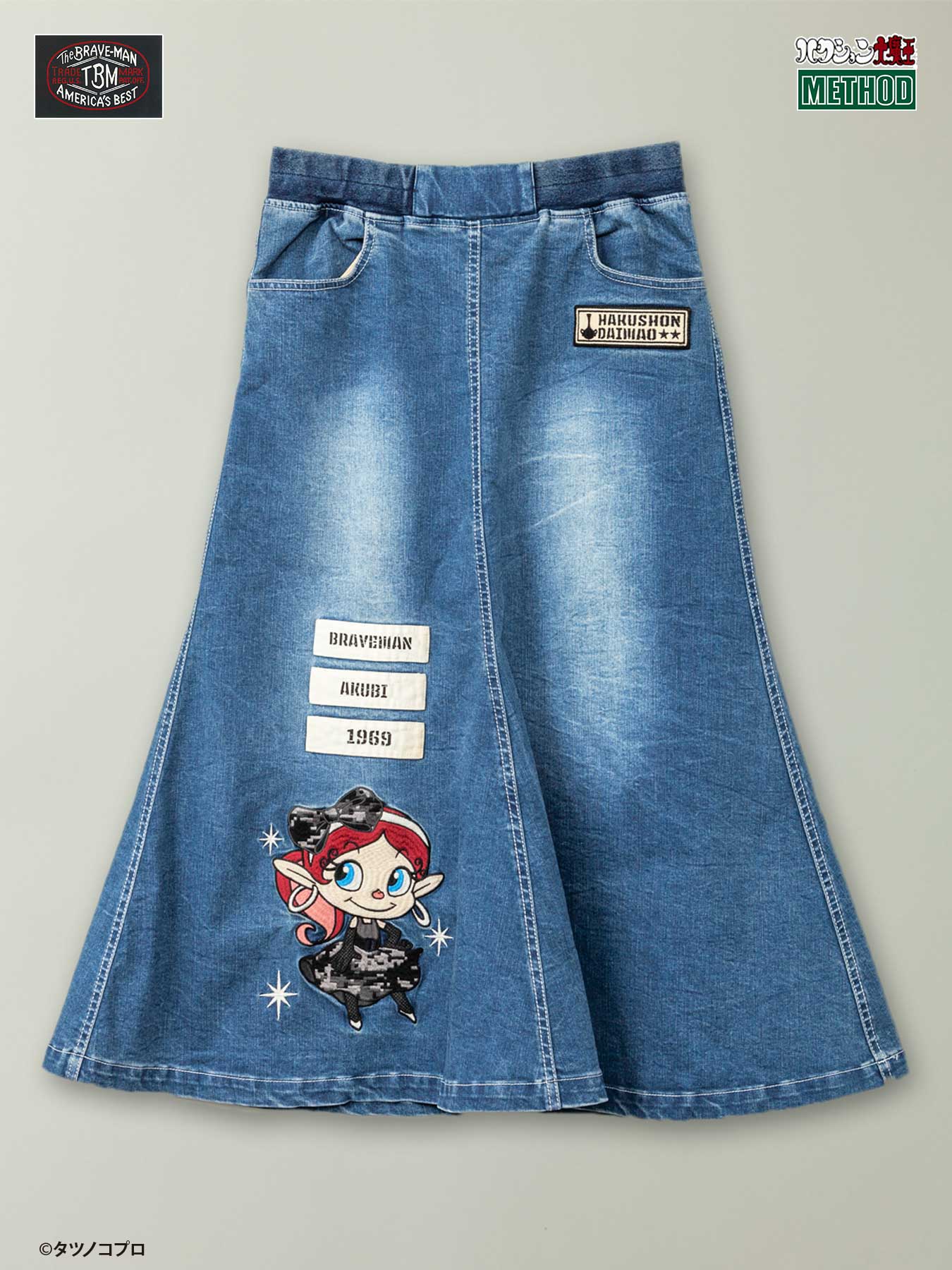 ≪CSMEN 別注商品≫ ・「ハクション大魔王」コラボレーションアイテム ・柔らかで伸縮性のあるストレッチデニム生地 ・ヴィンテージ感のあるブラスト加工 ・4ポケット 【The BRAVE-MAN】よりソフトなデニム生地をベースにした新作のロングスカートが登場。