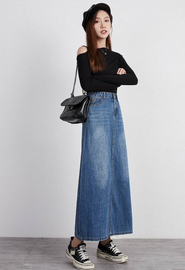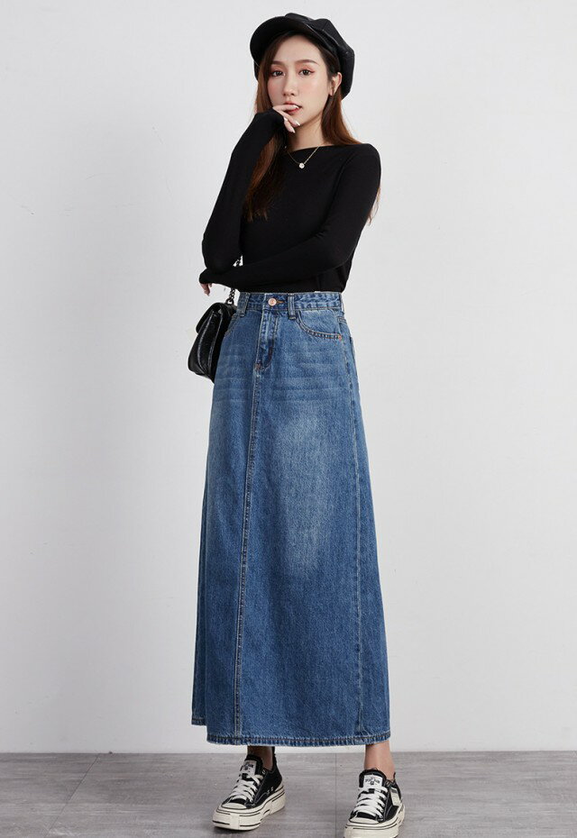 コーデしやすいシンプルな定番ラインの デニムロングスカート。