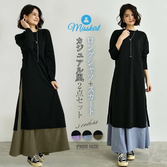 ロングシャツ+スカート 2点セット フレア ロングワンピース レディース 無地 体型カバー 長袖 ロング丈 ミモレ丈 大きいサイズ ゆったり 着痩せ 春 夏 秋 冬 着痩せ スリット 20代 30代 40代 50代 通勤 OL お洒落 可愛い 大人 送料無料