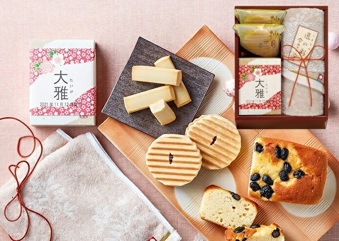 しっとりとした黒豆パウンドケーキや、豆乳を練り込みソフトな食感に焼き上げたクッキー、 なめらかなクリームとサックリした生地の調和を楽しむことが出来るヴァッフェルなど、 にもお茶の時間にもよく合う和菓子と今治タオルのギフトセットです。